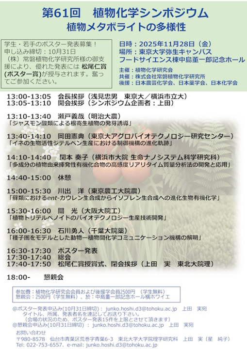 2025年11月28日(金) 植物化学研究会主催の「第61回植物化学シンポジウム」が東京大学弥生キャンパスにて開催され、今年度も植物化学研究会と共催で「第3回松尾仁賞」を贈呈いたします。