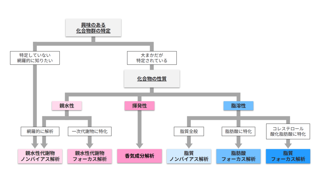 メタボローム解析では、「親水性代謝物ノンバイアス解析」、「親水性代謝物フォーカス解析」、「香気成分解析」、「脂質ノンバイアス解析」、「脂肪酸フォーカス解析」、「脂質フォーカス解析」の6つのサービスを提供しております。